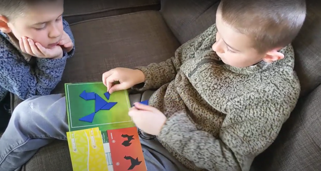 Another great on-the-go item is tangrams. We use magnetic sets that come with a book of image prompts. This classic brain teaser shows a picture, and the challenge is to recreate it using the shapes provided. Everything sticks together and folds up neatly, making it ideal for travel or passing back and forth.