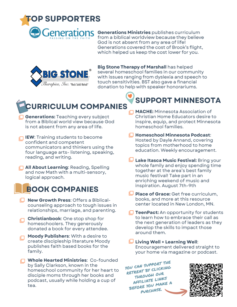 The only sales at the retreat are event merch and products by the speakers. We do not invite vendors to come because we don’t want you to feel pressured to buy anything. However, there is great benefit to being able to flip though curriculum and find useful resources. The following are companies that our team members personally recommend. They have also sent product for you to be able to see in person or as giveaways for attendees to take home. We appreciate each donation, especially those who are able to make financial contributions that help keep our cost down.